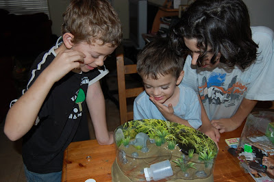 Or a boy. We won't know until he or she becomes a frog. Everett got his tadpole today, and was he ever excited. I was a little bit frustrated with the mail carrier since the packaging said "Live animal, DO NOT LEAVE IN MAILBOX" all over it, and she had in fact left it in the mailbox. Thankfully, my minor frustration waned when we opened the package and found the tadpole alive and well, swimming with all its might in the little baggie of water. We had to make an emergency run to the grocery store because it needed bottled spring water which we didn't have on hand, and we were all relieved it was still alive after that as well. It's all set up now in its little habitat, temporarily living on the kitchen counter. That's the other thing that Santa didn't think of. Where exactly are we going to put all these creatures?